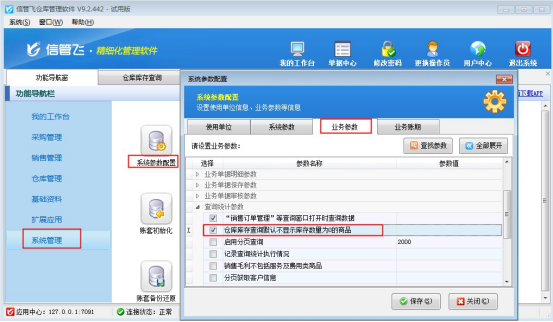 在功能導航窗點擊“系統管理”—“系統參數配置”,選擇“業務參數”中的“查詢統計參數”,勾選參數“倉庫庫存查詢默認不顯示庫存數量為0的商品”然后保存配置。如下圖所示: