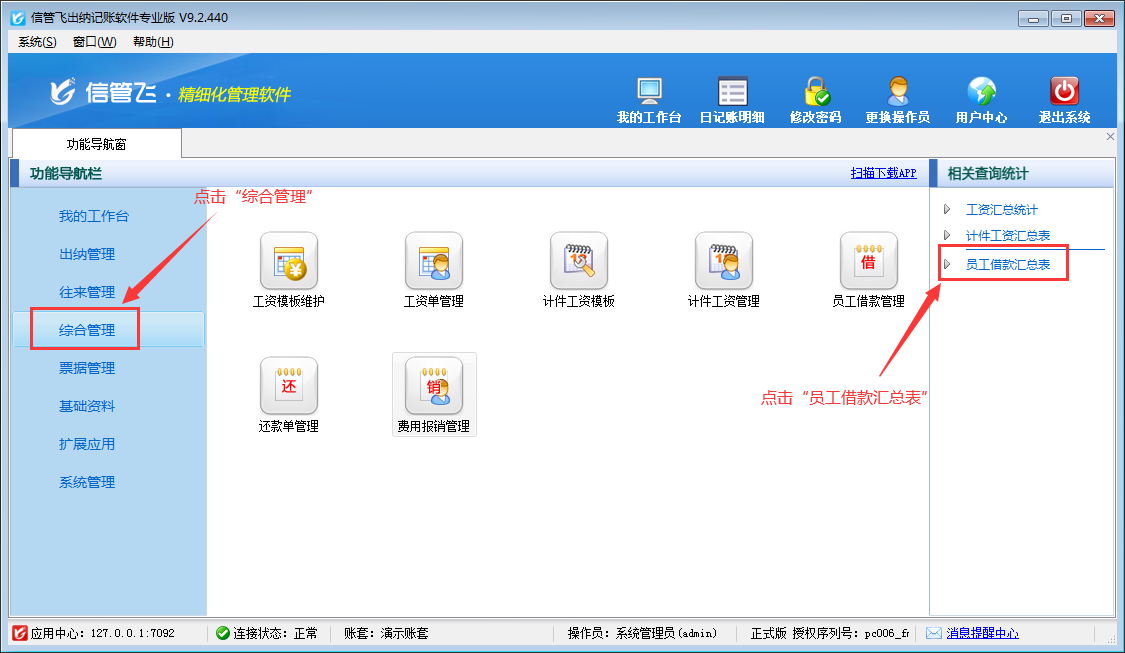 在功能導航窗點擊“綜合管理”—》“員工借款匯總表”即可進入員工借款匯總表界面,如下圖所示。