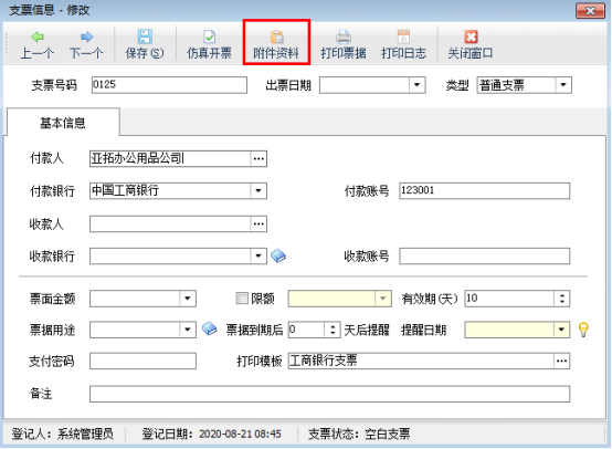 信管飛票據打印軟件開單后,自動保存數據,方便以后查閱或打印,填開支票、承兌匯票、快遞單以及其他票據時,軟件支持添加文檔、圖表等附件資料,可掃描或導入與票據相關的電子文件,方便用戶更全面、直接地查詢票據的全過程,有利于企業票據管理控制(如下圖所示)。為避免每個操作員都可以查看到票據的附件資料,軟件支持控制操作員的可查看附件資料權限。本文介紹一下如何設置操作員不可查看附件資料?