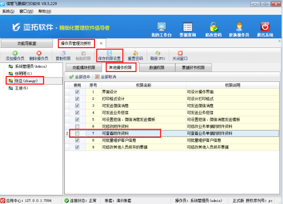 在功能導航窗點擊“系統管理”—》“操作員及授權”打開操作員管理及授權界面,選擇操作員“張亞”,在“其他操作權限”中把權限“可查看附件資料”勾選取消,然后點擊“保存權限設置”按鈕保存權限設置,如下圖所示: