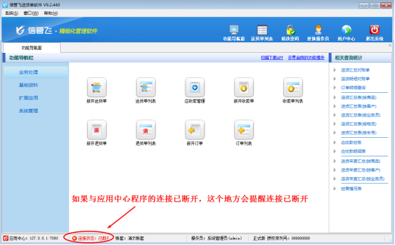 信管飛RMS、信管飛倉庫管理軟件、信管飛票據打印軟件、信管飛出納記賬軟件、信管飛送貨單軟件都包括客戶端程序和應用中心程序兩個模塊,客戶端程序登錄系統(tǒng)時,應用中心程序是必須打開的。如果主機電腦關機或關閉應用中心程序、程序出現(xiàn)異常等,客戶端程序與應用中心的連接就會斷開。應用中心程序再次正常運行后,客戶端程序需要重新建立與應用中心程序的連接。下面我們以信管飛送貨單軟件為例介紹一下客戶端程序重連應用中心程序的操作方法。