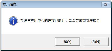 第一種解決方式:鼠標雙擊軟件界面最下方的“連接狀態(tài):已斷開”字樣,系統(tǒng)會彈出“系統(tǒng)與應用中心的連接已斷開,是否嘗試重新連接?”提示信息,如圖2所示,點“是”按鈕,客戶端程序會嘗試重新建立與應用中心程序的連接。如果連接成功即可打開相應的功能,繼續(xù)使用軟件。