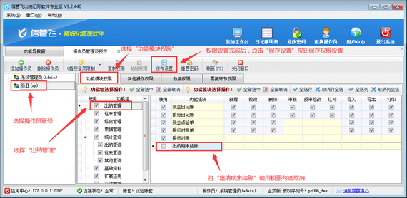 另外,軟件支持操作員賬號及權限管理功能,支持設置多個操作員賬號可登錄軟件,本篇文章介紹一下如何設置操作員不可操作出納期末結賬功能?