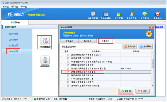 在功能導(dǎo)航窗點擊“系統(tǒng)管理”—》“系統(tǒng)參數(shù)配置”—》“業(yè)務(wù)參數(shù)”,即可進(jìn)入到“業(yè)務(wù)參數(shù)”配置界面,在業(yè)務(wù)單據(jù)相關(guān)參數(shù)內(nèi)打鉤啟用“銷售開單顯示客戶欠款信息”參數(shù),然后保存配置,如下圖所示: