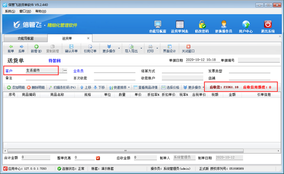 配置保存后,在功能導(dǎo)航窗點擊“業(yè)務(wù)處理”—》“新開送貨單”,在新開送貨單界面選擇客戶名稱后,此時可以看到單據(jù)明細(xì)上方會顯示這個客戶的應(yīng)收款信息,即客戶的欠款,如下圖所示: