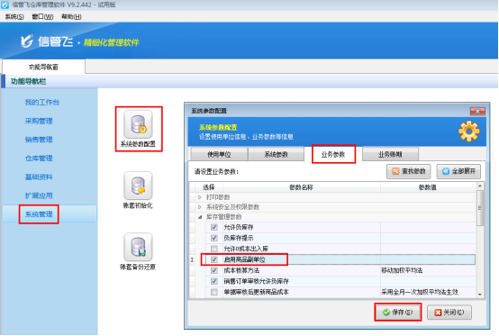在功能導航窗中點擊“系統(tǒng)管理”—》“系統(tǒng)參數(shù)配置”,即可進入“系統(tǒng)參數(shù)設(shè)置”界面,點擊“業(yè)務(wù)參數(shù)”,如圖1所示,在庫存管理參數(shù)內(nèi)找到“啟用商品副單位”參數(shù),勾選這個參數(shù),然后保存。