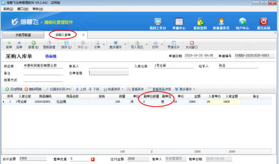 商品保存后,在功能導航窗點擊“采購管理”—》“采購入庫單”,新增采購入庫單,在業(yè)務(wù)單據(jù)明細中可以輸入副單位的數(shù)量,如圖3所示。