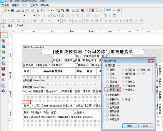 需要合計(jì)在最后一頁(yè)顯示,需要把“頁(yè)注腳”換為“數(shù)據(jù)注腳”,在模板設(shè)計(jì)器界面,點(diǎn)擊“頁(yè)注腳”進(jìn)行刪除,然后點(diǎn)擊左側(cè)工具欄的第一項(xiàng),選擇“數(shù)據(jù)注腳”,添加到合計(jì)的位置處,如下圖所示: