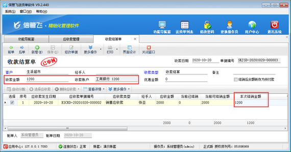 在應收款管理界面點擊“收款結算”按鈕可以打開收款結算單對應收款進行收款結算,如下圖所示,在收款結算單單據主體選擇收款賬戶后錄入“收款金額”1200元,單據明細中“本次結銷金額”錄入1200元,保存收款結算單即可。