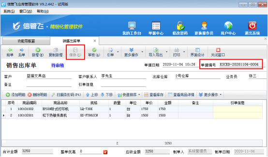 在功能導(dǎo)航窗點(diǎn)擊“銷售管理”—》“銷售出庫(kù)單”,開單并保存單據(jù),單據(jù)會(huì)直接自動(dòng)生成一個(gè)單據(jù)編號(hào),如下圖1所示: