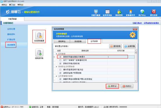 在業(yè)務(wù)參數(shù)界面將打印參數(shù)內(nèi)“報(bào)表打印超過指定次數(shù)提示”勾選上,并將打印次數(shù)設(shè)置一下,軟件中默認(rèn)的打印次數(shù)是1,可以根據(jù)自己的實(shí)際需求進(jìn)行設(shè)置,最后進(jìn)行保存。