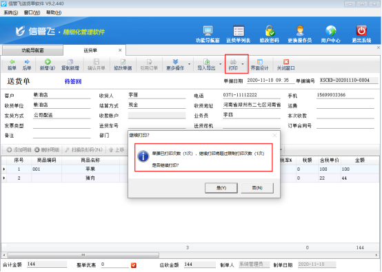 設(shè)置報(bào)表打印超過打印次數(shù)提示后,在業(yè)務(wù)單據(jù)打印時(shí)(基礎(chǔ)資料、統(tǒng)計(jì)查詢功能中沒有限制)如果單據(jù)打印的次數(shù)超過限制數(shù)量,系統(tǒng)會提示“單據(jù)已打印次數(shù)(1次),繼續(xù)打印將超過限制打印次數(shù)(1次),是否繼續(xù)打印?”,如下圖所示: