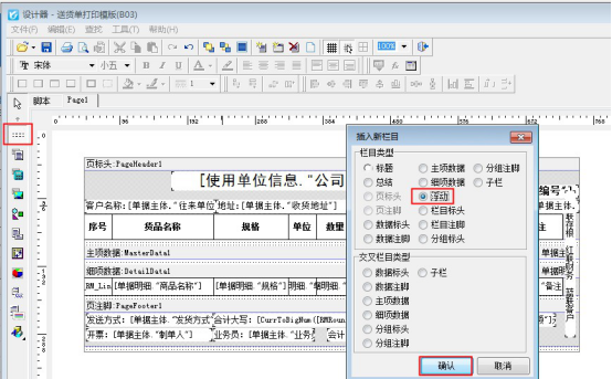 如何設置打印多頁時,每一頁都顯示多聯備注內容,下邊進行示范,首先進入模板設計器界面(開單界面打印按鈕下點擊打印格式設計,在打印格式設計界面選擇模板點擊設計格式進入設計器界面),點擊左側工具欄的“插入邊條”,選擇“浮動”位置放到多聯備注處,包圍備注內容,如下圖所示: