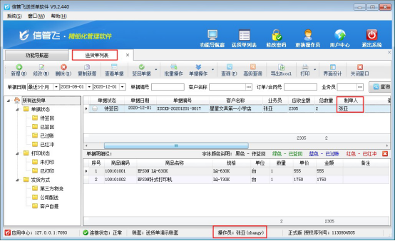 信管飛送貨單軟件支持設置多個操作員登錄軟件,為避免不同操作員登錄軟件查看其他人單據,軟件支持設置操作員權限,只能查看自己的開單單據,以“送貨單”為例,示范下如何設置操作員只能查看自己的單據。