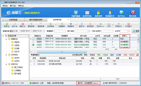 使用“系統管理員”登錄軟件,在送貨單列表中可以查看到所有人開的單據(系統管理員默認有所有權限)。如下圖所示: