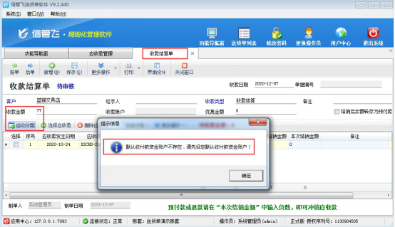 信管飛送貨單軟件是一款集開單送貨和應收款管理的軟件,軟件開單后可對開單生成對應的應收款進行收款結算,有客戶開收款結算單時候,輸入收款金額點擊保存會提示“默認收付款資金賬戶不存在,請先設定默認收付款資金賬戶!”,無法保存單據,如下圖所示: