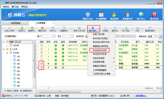 信管飛出納記賬軟件專業版包括工資管理功能,支持自定義工資模板,可根據設置的工資模板快速生成工資單,支持從上月工資單復制工資項目數據,每月工資發放后,可將工資記錄標記為簽領狀態,如下圖所示,本文介紹一下出納記賬軟件中如何標記工資記錄為已簽領狀態?