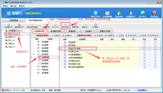 登錄軟件,在功能導(dǎo)航窗點(diǎn)擊“系統(tǒng)管理”—》“操作員及授權(quán)”,進(jìn)入“操作員管理及授權(quán)”界面,選擇操作員“張亞”,在其右側(cè)的功能模塊權(quán)限內(nèi)選擇“出納查詢”模塊,將資金日(月)報(bào)表的“使用”權(quán)限勾選取消,然后保存設(shè)置,如下圖所示。