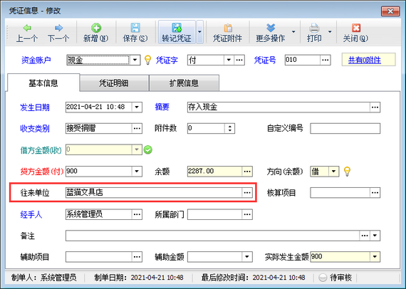 在功能導航窗點擊“出納管理”—》“現金日記賬”,新增日記賬憑證時選擇一下往來單位信息,如下圖所示。