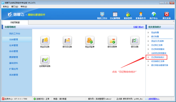 然后在“出納管理”模塊最右側的“相關查詢統計”內點擊“日記賬綜合統計”,打開“日記賬綜合統計”界面,如下圖所示。