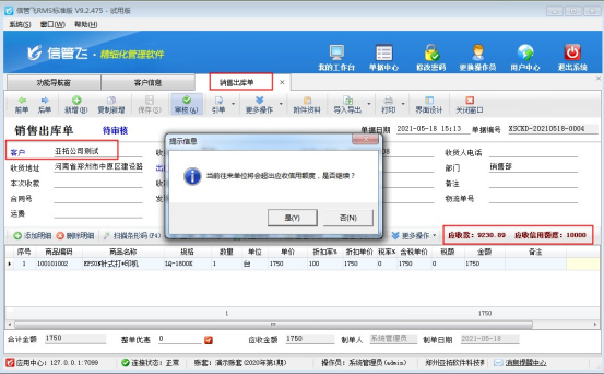 本文以“信管飛RMS標(biāo)準(zhǔn)版為例”,示范下如何鎖定超出信用額度的客戶。超出信用額度的客戶“亞拓公司測試”在未設(shè)置鎖定前,開銷售出庫單審核單據(jù)會(huì)提示“當(dāng)前往來單位將會(huì)超出應(yīng)收信用額度,是否繼續(xù)”,點(diǎn)擊“是”仍可以保存成功,如下圖所示: