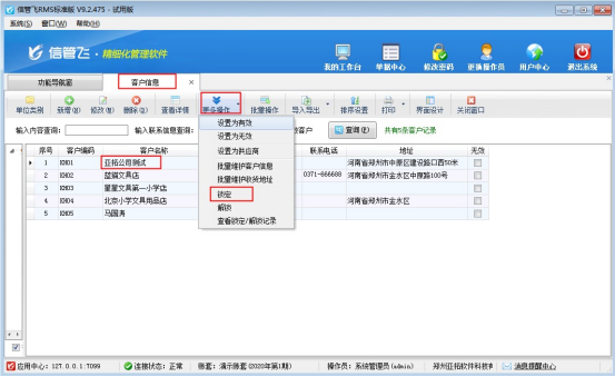 在功能導(dǎo)航窗點(diǎn)擊“基礎(chǔ)資料”—》“客戶信息”,在客戶信息界面選擇客戶“亞拓公司測試”,選擇工具欄“更多操作”下的“鎖定”,可鎖定此客戶信息,鎖定狀態(tài)為紅色顯示,如下圖所示: