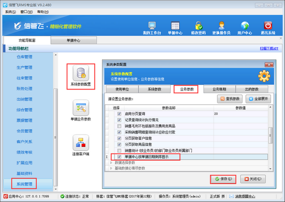 如需設置單據(jù)中心按單據(jù)日期倒敘顯示,優(yōu)先顯示最新日期的單據(jù),也可以在系統(tǒng)參數(shù)配置中啟用參數(shù)“單據(jù)中心按單據(jù)日期倒敘顯示”,如下圖所示,在功能導航窗點擊“系統(tǒng)管理”—》“系統(tǒng)參數(shù)配置”—》“業(yè)務參數(shù)”打開業(yè)務參數(shù)配置界面,將查詢統(tǒng)計參數(shù)中“單據(jù)中心按單據(jù)日期倒敘顯示”參數(shù)啟用一下,然后保存配置。