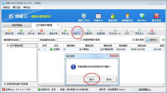 在生產模板BOM管理界面,選擇一個已審核的生產模板,在工具欄中點擊“反審”按鈕,系統彈出提示信息“您確定要反審當前選擇的生產模板?”,然后點擊“是”按鈕對已審核的生產模板進行反審操作,如下圖所示。
