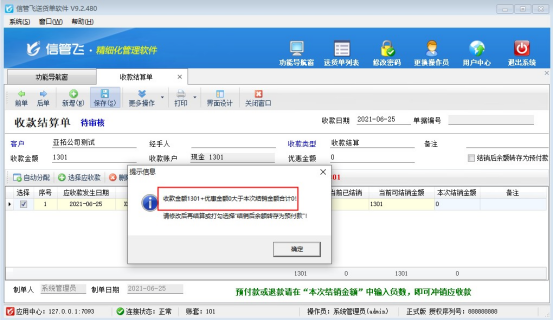 信管飛軟件包括信管飛RMS軟件、信管飛出納記賬軟件、信管飛送貨單軟件(送貨單軟件只有應收款),支持對應收應付款進行收付款結算操作,方便用戶查看收付款情況。對于客戶在結算時保存不了結算單,本篇文章以收款結算單進行示范下如何解決。