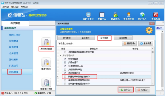 在功能導航窗點擊“系統(tǒng)管理”—》“系統(tǒng)參數(shù)配置”選擇“業(yè)務參數(shù)”,找到參數(shù)“銷售訂單審核允許負庫存”取消勾選,然后保存配置,如下圖所示: