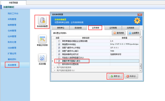 在功能導(dǎo)航窗點(diǎn)擊“系統(tǒng)管理”—》“系統(tǒng)參數(shù)設(shè)置”—》“業(yè)務(wù)參數(shù)”打開業(yè)務(wù)參數(shù)配置界面,如下圖所示,在特殊功能參數(shù)中找到“銷售開單可查看入庫價(jià)”參數(shù),勾選啟用此參數(shù),然后點(diǎn)擊“保存”按鈕保存參數(shù)配置。
