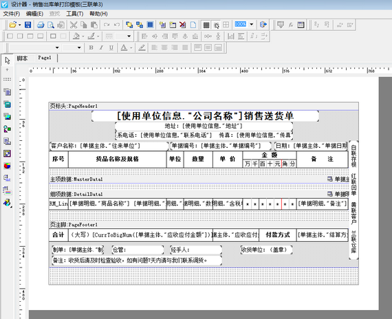 打開一個已保存的送貨單,然后在單據界面點擊“打印”—“打印格式設計”按鈕,進入“送貨單打印格式設計”界面,以內置模板銷售出庫單打印模板(三聯單3)為例,選擇此打印格式模版,然后點擊“設計格式”按鈕進入模版設計器界面,如下圖所示。