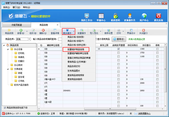 然后在商品信息界面,工具欄點(diǎn)擊“更多操作”—》“批量維護(hù)商品信息”進(jìn)入“批量維護(hù)商品信息”界面,如下圖所示: