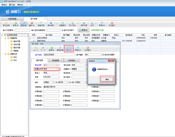 選擇員工后,修改客戶信息界面所屬業(yè)務(wù)員已修改為“張亞”,點擊保存,即彈出提示框“數(shù)據(jù)保存成功!”,保存鍵變?yōu)榛疑H缦聢D所示: