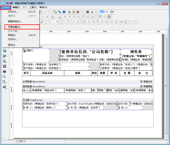 在打印格式設(shè)計(jì)界面,選擇打印格式模板點(diǎn)擊“設(shè)計(jì)格式”,進(jìn)入打印格式設(shè)計(jì)器界面。在模板設(shè)計(jì)器中點(diǎn)擊左上角“文件”,彈出的界面上點(diǎn)擊“頁(yè)面設(shè)置”,進(jìn)入頁(yè)面設(shè)置界面,如下圖所示: