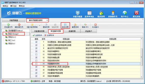 在功能導航窗點擊“系統管理”—》“操作員及授權”打開操作員管理及授權界面,選擇操作員“張亞”,在“其他操作權限”中把權限“可查看附件資料”勾選取消,然后點擊“保存設置”按鈕保存權限設置,如下圖所示: