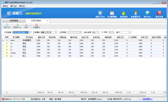 在功能導(dǎo)航窗點(diǎn)擊“綜合管理”—》“工資匯總統(tǒng)計(jì)”即可進(jìn)入工資匯總統(tǒng)計(jì)表界面,如下圖所示。