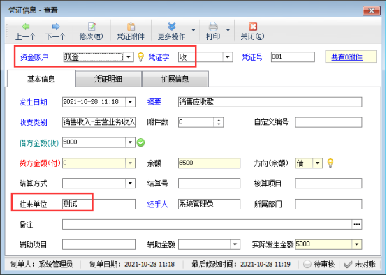 功能導航窗“往來管理”—》“應收款管理”中,新增一筆客戶“測試”的應收款記錄,應收金額5000元,保存并轉記現金憑證,如下圖所示:
