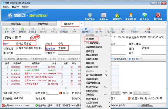 打開倉庫名稱有誤的銷售出庫單,點擊“更多操作”—》“紅沖單據”,來將“已審核”的單據進行紅沖,紅沖后的單據會變為無效,紅沖相當于作廢,相應的應收款會刪除,之前對庫存的影響也會解除。如下圖所示: