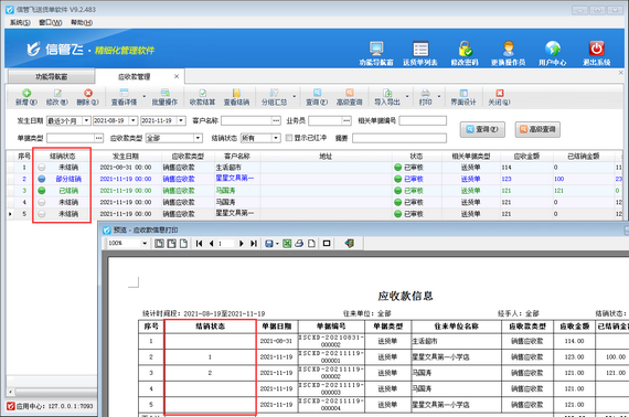 在應 設置完成后,重新進行打印預覽,即可正常打印應收款結銷狀態,如下圖所示。 歡迎下載試用這款支持自定義打印格式模板的送貨單打印軟件:信管飛送貨單軟件。