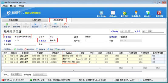 企業在開采購入庫單和銷售出庫單時都存在開發票的情況,信管飛RMS軟件發票管理功能可以讓企業高效快速地管理發票信息。發票管理功能支持對進銷項發票的領購登記、使用(填開、作廢)等整個流程的管理,并能夠全面記錄銷項增值稅專用發票、銷項普通發票以及各種進項發票的開具信息。
