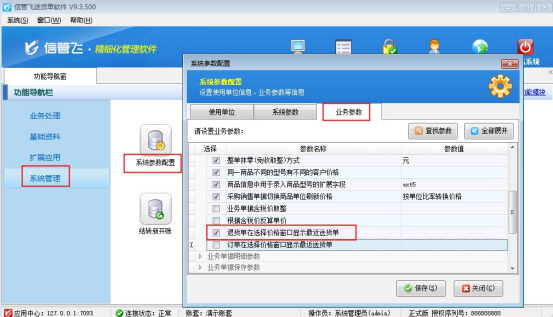 在功能導(dǎo)航窗點擊“系統(tǒng)管理”—》“系統(tǒng)參數(shù)配置”,把“業(yè)務(wù)參數(shù)”中的“退貨單在選擇價格窗口顯示最近送貨單”參數(shù)啟用保存,如下圖所示: