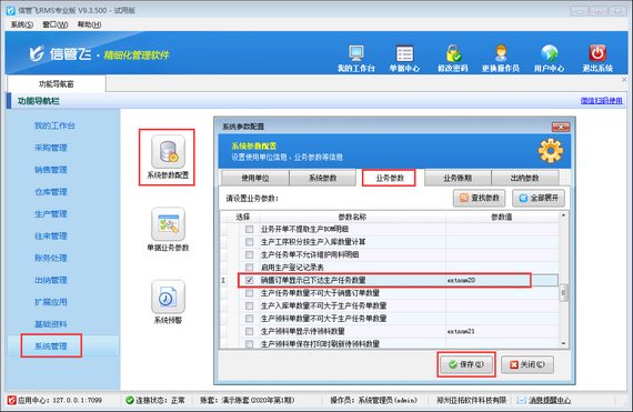 在功能導(dǎo)航窗點(diǎn)擊“系統(tǒng)管理”—》“系統(tǒng)參數(shù)配置”—》“業(yè)務(wù)參數(shù)”打開(kāi)業(yè)務(wù)參數(shù)配置界面,然后在生產(chǎn)管理相關(guān)參數(shù)中打鉤啟用“銷售訂單顯示已下達(dá)生產(chǎn)任務(wù)數(shù)量”參數(shù),并設(shè)置參數(shù)值,默認(rèn)為“extnum20(擴(kuò)展數(shù)值20)”,如下圖所示。