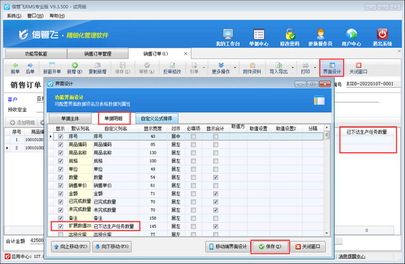 參數(shù)配置完成之后,打開(kāi)銷售訂單,在“界面設(shè)計(jì)”—》“單據(jù)明細(xì)”中將“擴(kuò)展數(shù)值20”自定義列名為“已下達(dá)生產(chǎn)任務(wù)數(shù)量”,并勾選顯示出來(lái),如下圖所示。