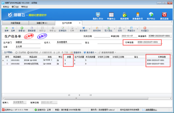 然后設(shè)置完成后,新開(kāi)生產(chǎn)任務(wù)單引用銷售訂單的情況下,即可看到銷售訂單界面“已下達(dá)生產(chǎn)任務(wù)數(shù)量”可自動(dòng)更新,如下圖所示。