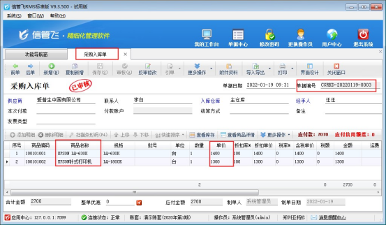 參數設置完成后,打開“采購管理”,新增一個采購入庫單,單據保存并審核,如下圖所示: