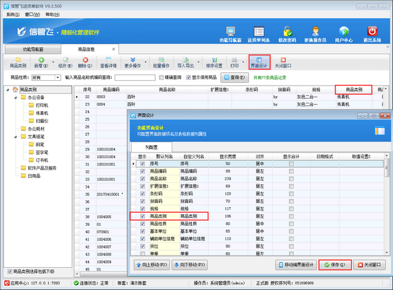 首先,在商品信息界面工具欄中點擊“界面設計”打開界面設計界面,將“商品類別”列配置顯示出來,如下圖所示。