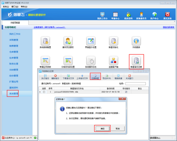 新建的賬套登錄后,同樣在功能導航窗中點擊“系統管理”—》“賬套備份還原”,在打開的“賬套備份還原”窗口,上傳備份文件并還原賬套,如下圖所示。