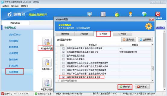 在功能導(dǎo)航窗點(diǎn)擊“系統(tǒng)管理”—》“系統(tǒng)參數(shù)配置”,“業(yè)務(wù)參數(shù)”中勾選啟用參數(shù)“業(yè)務(wù)單據(jù)價(jià)格參數(shù)”中的“銷售出庫單引用采購入庫單不引用價(jià)格”,保存參數(shù)設(shè)置。如下圖所示: