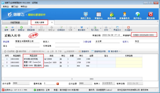 參數(shù)設(shè)置完成后,打開“采購管理”,新增一個(gè)采購入庫單,單據(jù)保存并審核,如下圖所示: